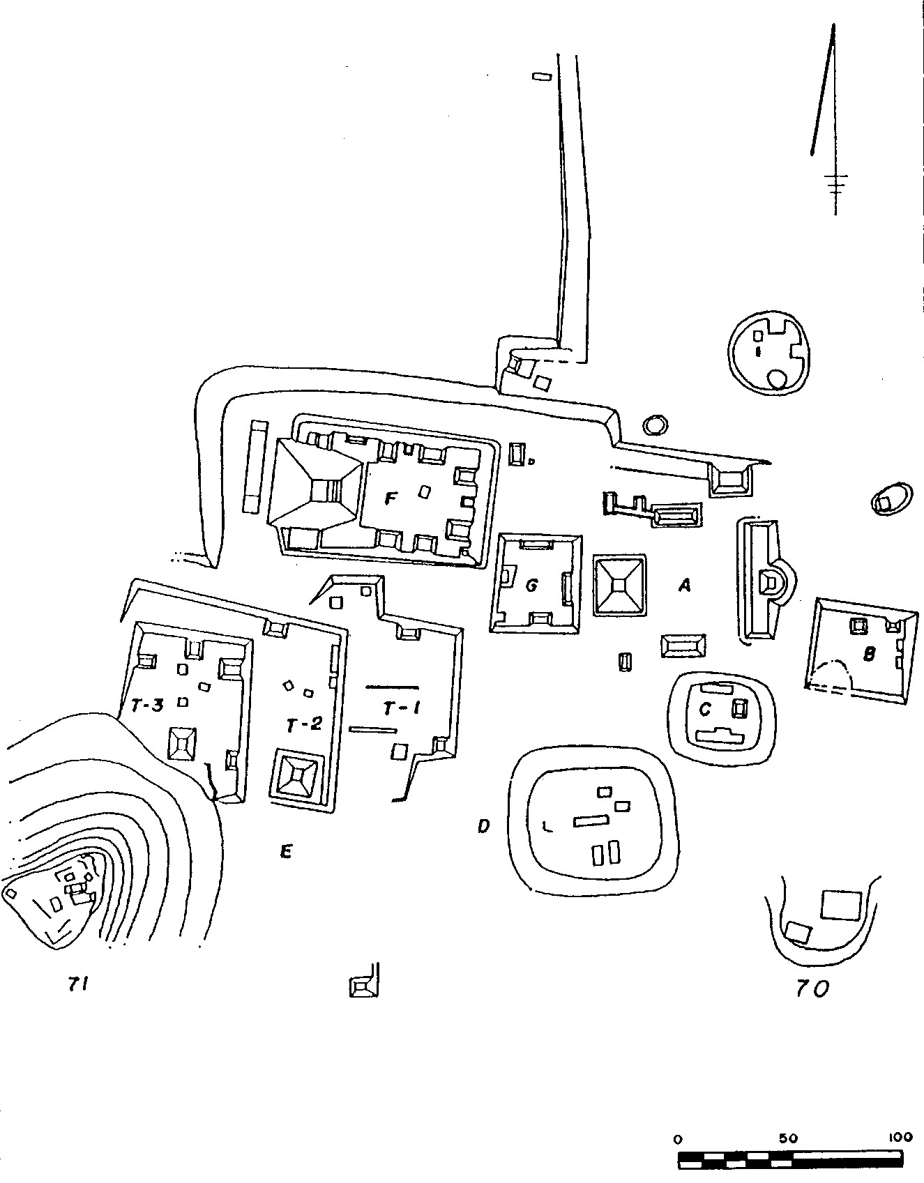 Grupo 7C‑I: consiste en una plataforma basal circular que sostiene 6 montículos pequeños alrededor de un patio central.