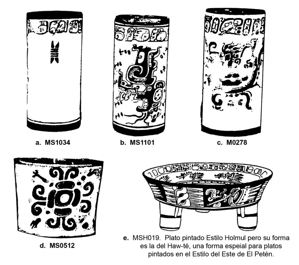 Las formas de las vasijas en estilo Códice incluyen platos de pared baja ligeramente curvo divergentes, cuencos o fuentes de pared baja y lados ligeramente curvo divergentes y cuencos y vasos bajos con paredes verticales, divergentes o curvo divergentes (Figura 2 a-c). La cerámica del este de Petén consta de altos vasos cilíndricos de paredes rectas, cuencos y fuentes con paredes más altas que las vistas en el estilo Códice y platos trípodes con paredes altas, curvo divergentes (Figura 2d-f). Los platos del este de Petén también tienen grandes soportes cilíndricos, siendo estas formas de platos el haw-te’ del periodo Clásico en lugar del plato simple (lak; Houston, Stuart y Taube 1989).