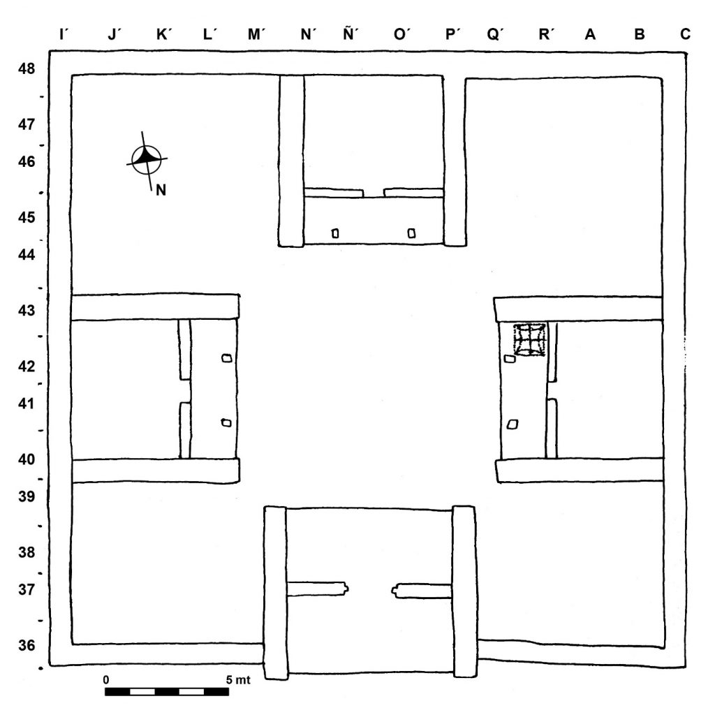 La unidad tiene un acceso central hacia el sur (Figura 1), con escalón y doble pórtico que conduce a un patio central del cual se puede entrar a cuatro espacios grandes y a tres recintos con sus respectivos pórticos. En los pórticos se conservan dos huellas de columnas de forma cuadrangular las que sostenían el techo. Se excavó en su totalidad la habitación situada al este del conjunto residencial y se sondearon las habitaciones norte y oeste. La habitación al oeste y el piso central se encontraron destruidos por lo que de haber habido un altar central, frecuente en los grupos habitacionales, éste fue destruido. Se encontraron tres piedras de lo que podría haber sido una esquina de éste.