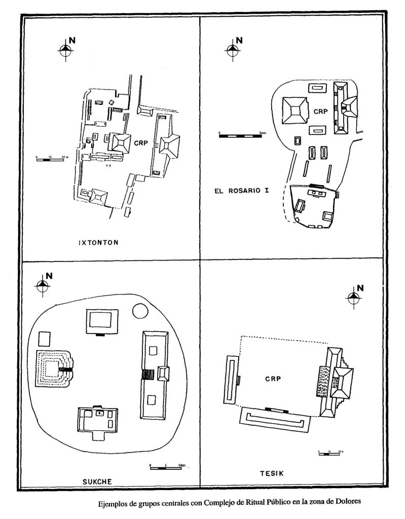 Como un ejemplo del tipo de asentamiento que representa a la zona de Dolores, referiremos el caso de una entidad política concreta, en este caso Ixtonton. Su sector central contiene todo lo que se podría esperar de un centro rector en las Tierras Bajas Mayas: varias plazas, juegos de pelota, calzadas y conjuntos arquitectónicos de función especializada, palacios y edificios de carácter ritual, todo organizado sobre una extensa plataforma basal (Figura 7). En la Plaza Este se configuró un Conjunto de tipo Grupo E, cuya estructura al este es la mayor de las registradas en la zona al superar el basamento los 100 m de largo. También hubo numerosas estelas, robadas antes de que el sitio hubiera sido reportado, quedando solamente dos de ellas, así como distintas espigas y altares lisos.