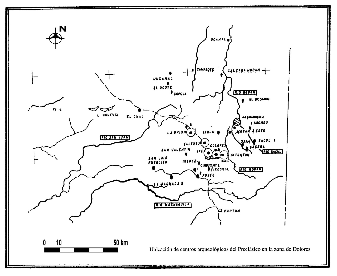 La multiplicidad de centros arqueológicos en la zona de Dolores ha permitido efectuar un análisis sobre las relaciones políticas y el grado de interdependencia entre ellos (Figura 1). Para ello, el concepto tradicional que considera la presencia de centros regionales mayores ha sido abandonado para favorecer la existencia de sectores con una cohesión interna enfocada hacia numerosos centros (Leventhal 1992; Laporte y Morales 1994), concepto que es de mucha utilidad en las áreas consideradas como periféricas a los núcleos de desarrollo primigenio, es decir aquellas fuera del norte de Petén, del río Pasión y del norte de Belice.