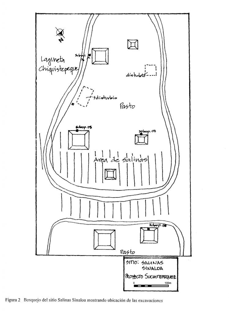 Durante la temporada 1996, el Proyecto Suchitepéquez continuó sus investigaciones en la costa baja de aquel departamento (Figura 1). Este año tuvo como principal objetivo hacer excavaciones de prueba en el sitio Sinaloa. Este sitio se localiza a orillas de la laguna Chiquistepeque y actualmente es una salina. En los recorridos del año pasado, se observó material cerámico de las fases Cuadros y Ocós. Por esta razón quisimos excavar los montículos del sitio para determinar exactamente su secuencia de ocupación. Este sitio comparte las mismas características de patrón de asentamiento a orilla del estero que los otros sitios Formativo Temprano de la Costa del Pacífico de Guatemala.