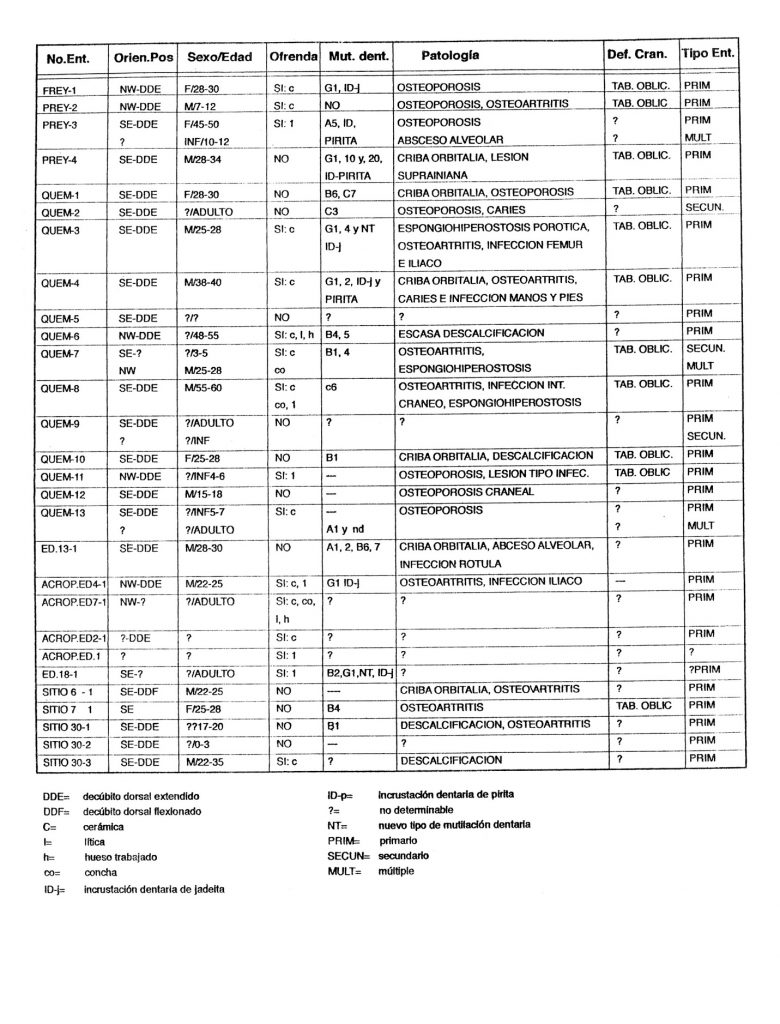 Por otra parte, debido a que todos los individuos adultos presentan mutilación dentaria, nos hace pensar que pertenecían a clases altas de la sociedad. Sin embargo, la mayor parte de ellos, al igual que los individuos infantiles presentan un fuerte proceso de descalcificación, ¿problemas dietéticos?, ¿problemas congénitos? Las excepciones corresponden principalmente a los entierros con orientación al noroeste y que también coinciden en su mayoría con su ubicación privilegiada dentro de los conjuntos, los escasos con orientación sureste siempre están cercanos a la presencia de cilindros de piedra.