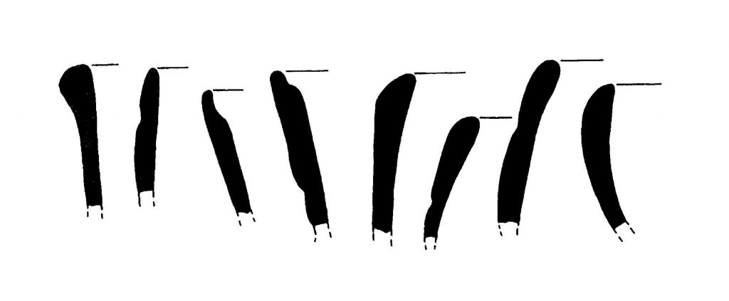 FORMAS: Unicamente cuencos, de paredes ligeramente curvo convergentes, con bordes directos con engrosado redondo exterior, posiblemente y como consecuencia de las dimensiones, las bases fueron planas. Cuencos pequeños y de regular tamaño, de paredes curvas convergentes, borde directo, generalmente redondo, desconocemos las bases e igualmente si hubo no asas.