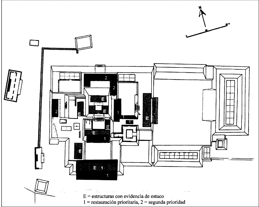 Las investigaciones preliminares en 1999 y 2000 permitieron definir algunas de estas características generales del Palacio (Barrientos, Kovacevich y Morán 2001), pero también revelaron otros aspectos, como materiales de construcción y una cronología preliminar de ocupación. En la temporada 2001 se iniciaron excavaciones y registros de carácter intensivo que incluyeron un mapa detallado realizado en conjunto con Luis Fernando Luin (Figura 3) y un registro fotográfico de rasgos arquitectónicos. Se contó con la asesoría de Rudy Larios para la supervisión y asesoría de excavaciones, así como para la definición de los criterios y planes de la futura restauración. Las excavaciones en el Palacio durante 2001 fueron de carácter horizontal y superficial, enfocándose en la exposición de rasgos para definir la arquitectura de las estructuras, sus dimensiones, patrones de distribución espacial y posible función.