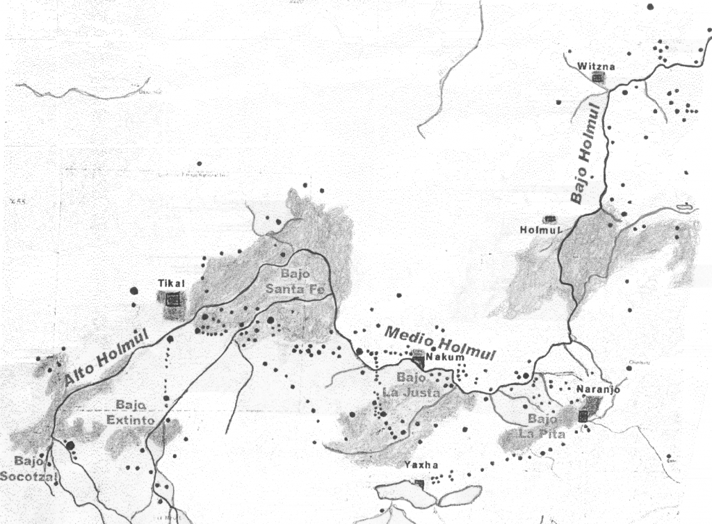 Desde 1994, el Proyecto Protección de Sitios Arqueológicos de Petén (PROSIAPETEN), del Instituto de Antropología e Historia de Guatemala (IDAEH), co- financiado por el gobierno de Alemania, ha apoyado investigaciones de patrón de asentamiento en la región noreste de Petén. Diez años de trabajos intensivos de campo han hecho posible conocer 286 sitios que no habían sido reportados y comparar cuatro amplias sub-regiones relacionadas con los espacios territoriales y culturales que existieron entre los antiguos estados Mayas de Tikal, Nakum, Yaxha y Naranjo. El elemento geográfico compartido por estas entidades políticas es la cuenca del río Holmul (Figura 1), que se extiende por espacio de 120 km desde la serranía al norte del lago Macanche, donde se origina, hasta la frontera de Guatemala con Belice, cuando se le conoce con el nombre de río Bravo, que finalmente desemboca en el mar Caribe.
