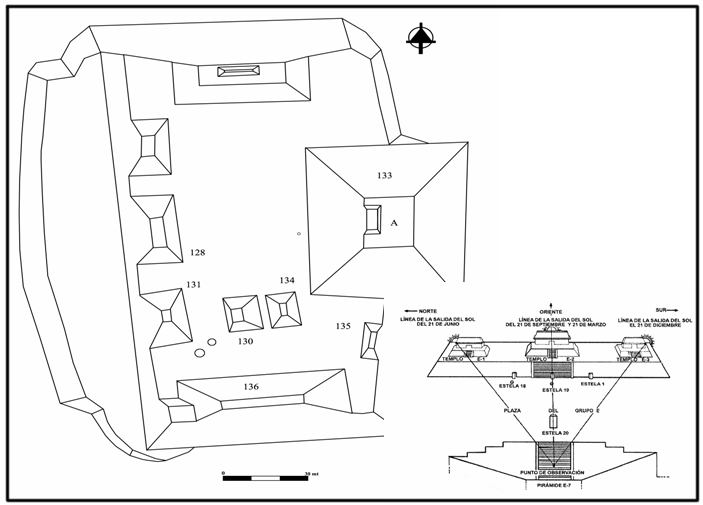 Además hay dos estructuras grandes (132,136) que cierran la plaza en los lados norte y sur (Davies 2005:406). Finalmente, el grupo tiene dos estructuras juntas (130,134) en la plaza, que tienen la forma de un patio para Juego de Pelota (Griffin y Kwoka 2005:101).