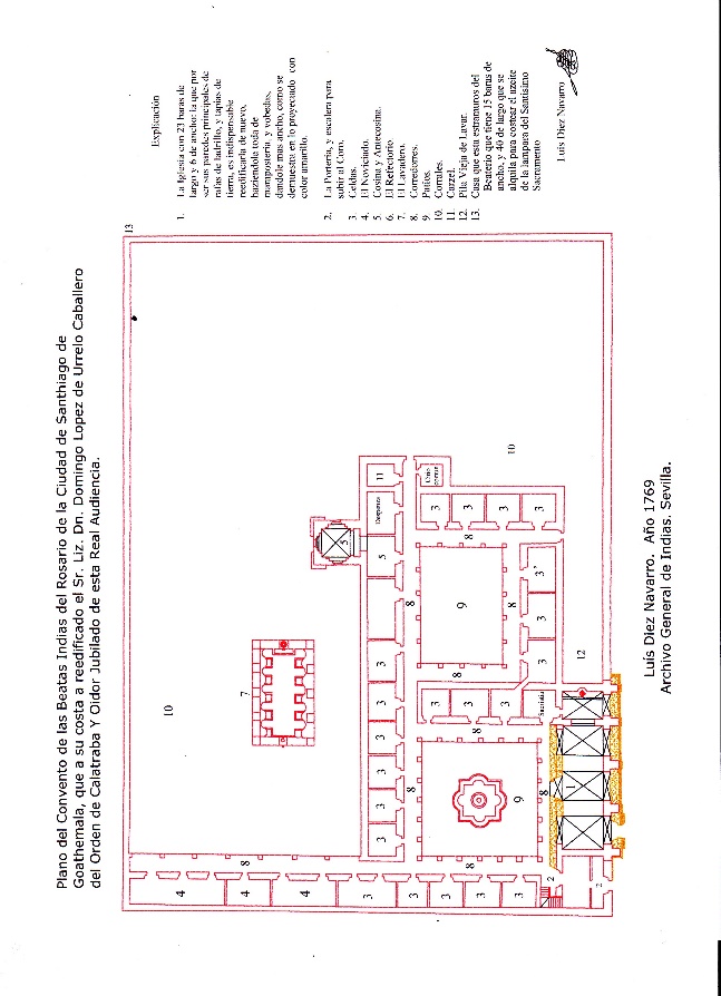 Por fortuna existe en el Archivo General de Indias un plano de este beaterio, fechado para 1769, el que fuera hecho por Luís Diez de Navarro. Dicho plano expone algunas reconstrucciones que tuvo este edificio, mismo que duraría poco tiempo hasta el devastador terremoto de 1773.