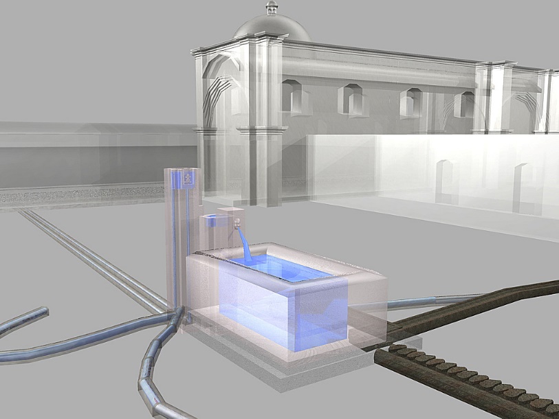 Figura 20 Proyección tridimensional del sistema hidráulico del complejo al Poniente del Beaterio de Indias, visualizando la iglesia de Santa Rosa de Lima al fondo. A. Ibáñez/J. Cáceres.