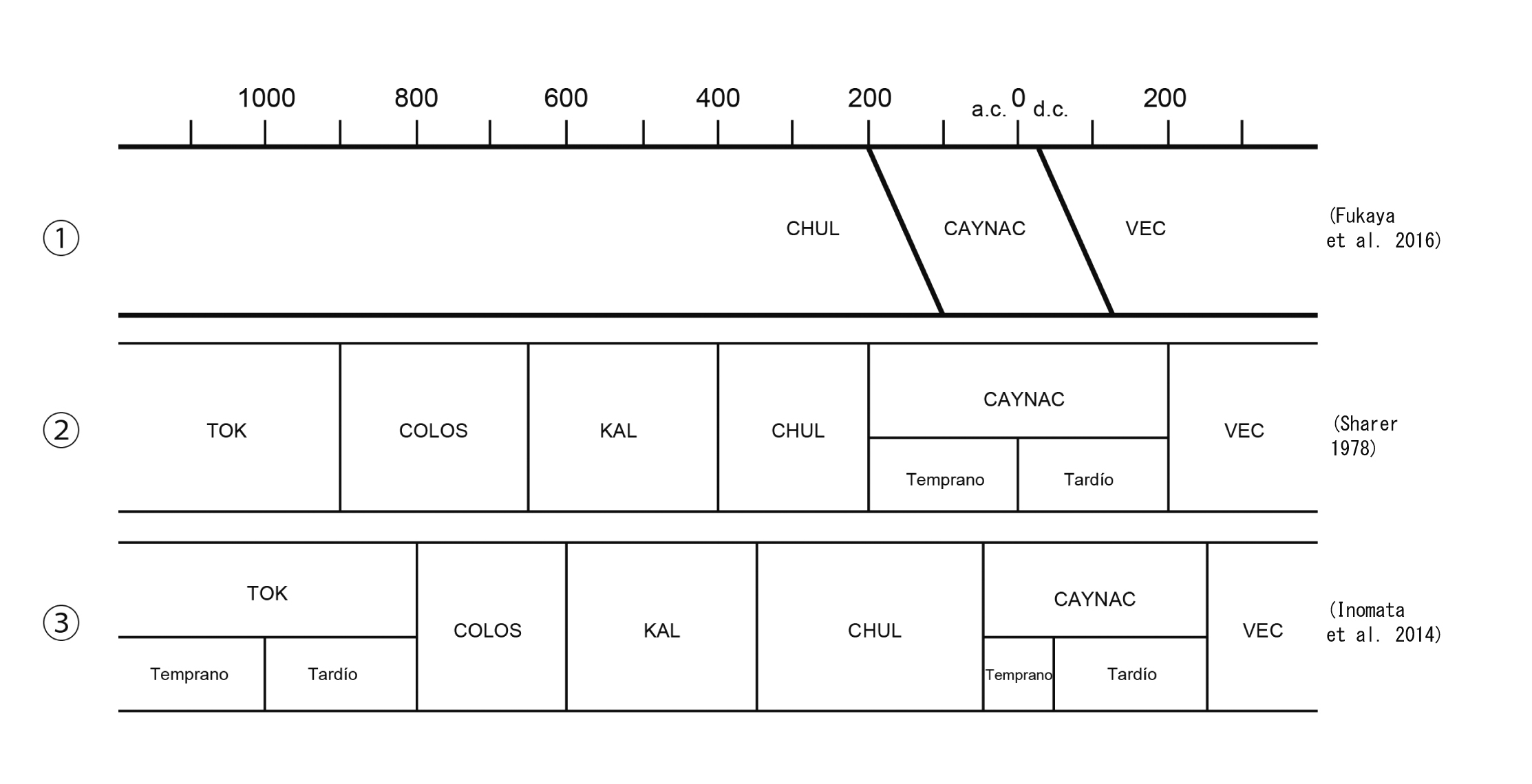 Los materiales arqueológicos del Complejo Cerámico Caynac se asocian con los carbones del Grupo A. Por lo tanto, es posible decir que Complejo Cerámico Caynac inició alrededor del 150 AC a más tardar. Y se puede decir que Complejo Cerámico Vec inició alrededor del 100 DC a más tardar porque los tiestos del Complejo cerámico Vec se encontraron con los carbones del Grupo C. Según el resultado del análisis, se muestra la cronología de Chul-Vec en Chalchuapa (Fig.2.1).