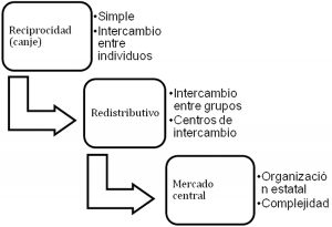 Económico: Las etapas socio-económicas evolucionan de reciprocidad entre individuos, a redistribución por un jefe y termina en el mercado público (Fig.6).