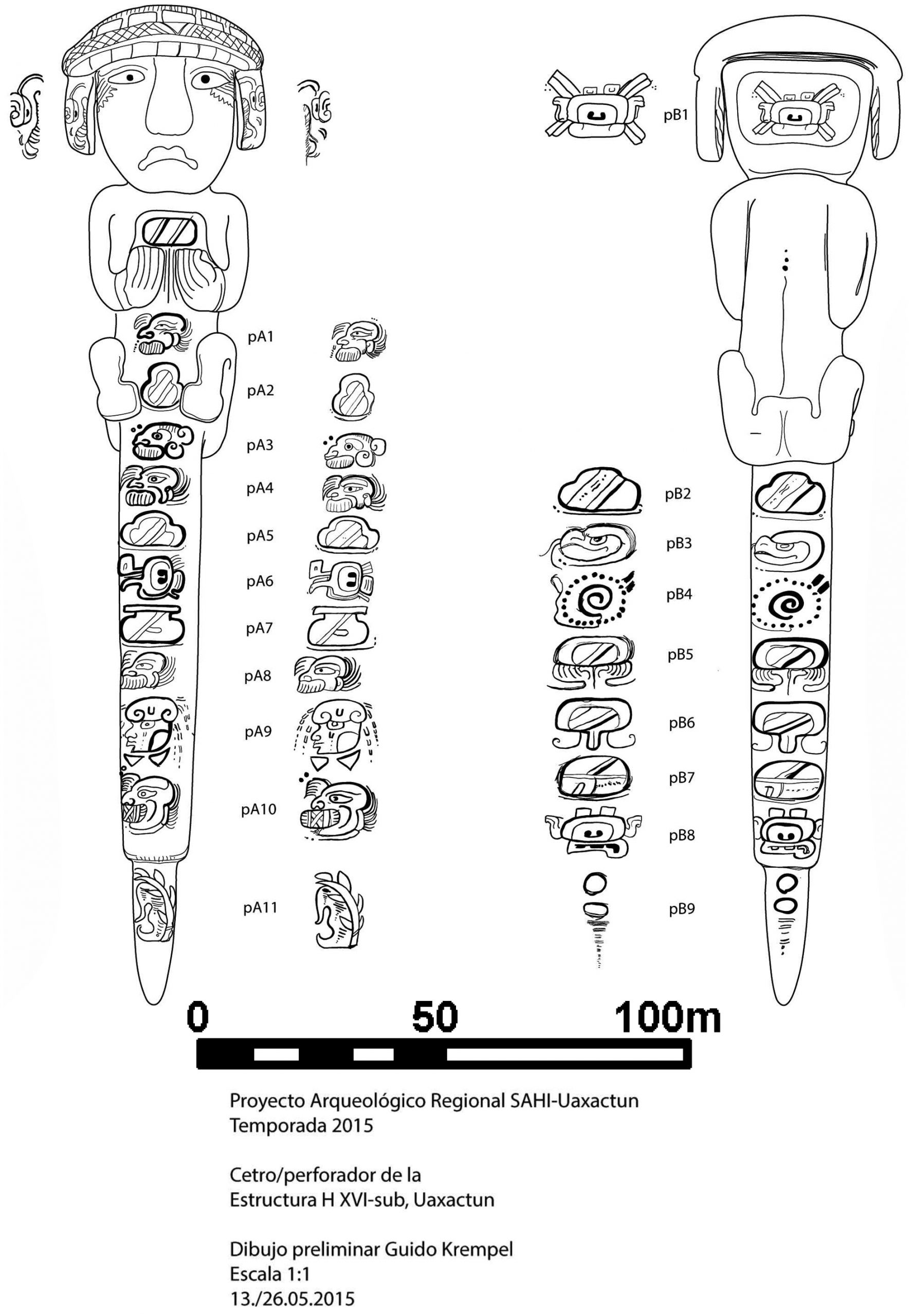 - Cetro/perforador de piedra verde: tiene 26 cm de longitud y 2.3 cm de ancho (Fig.7). Este objeto fue el que llamó más la atencion de todos los depositados en el interior de la vasija, por su forma, iconografía compleja y escritura presente en ambos lados. En cuanto a su función, se propone, al igual que otros objetos parecidos descubiertos en la historia mesoamericána, que tienen una punta en la parte inferior, que fue utilizado como un perforador para rituales de auto-sacrifico o sangría. A pesar que para perforar partes del cuerpo, especialmente el miembro viril, era mas común el uso de obsidiana, espinas o huesos, por su filo. En este caso más se podría hablar sobre un perforador simbólico que funcionó como un cetro; un simbolo de poder real, mostrando lo mas importante del poder sagrado de los soberanos mayas y su capacidad de ofrecer su sangre para los dioses (o ancestros) y así garantizar su merced para toda la comunidad.