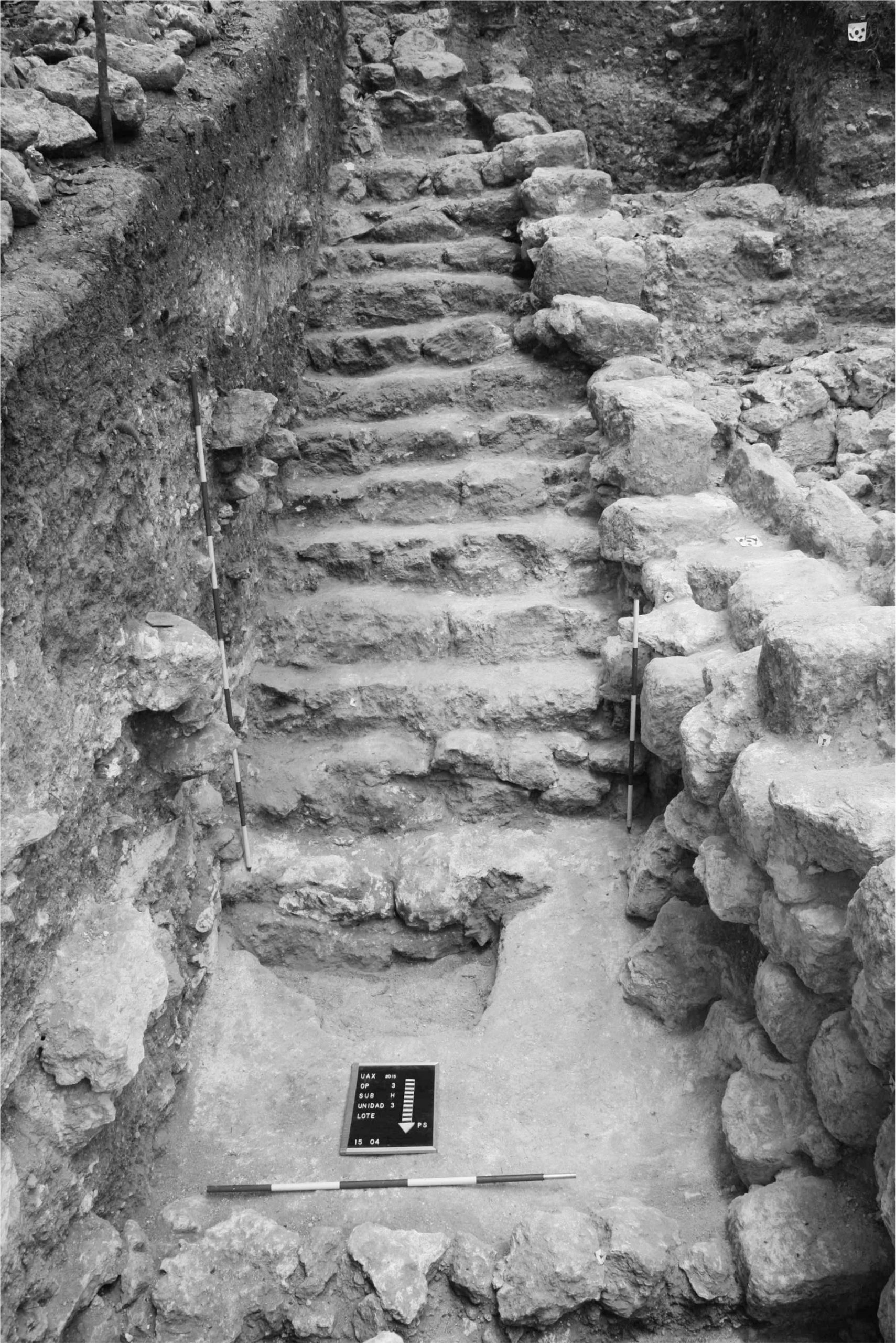 Fig. 2: Parte de escalinata de la fachada de la Plataforma Baja más temprana de El Tiburón. Se relaciona con la base de la fase Mamom (Fotografía Pavol Spišák).