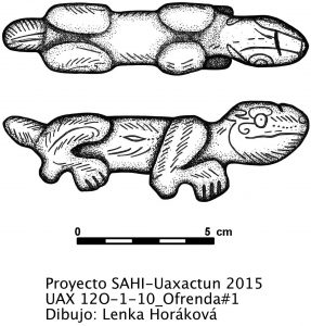 - Figurilla zoomorfa de piedra verde, tamaño de 11.5 x 3.5 cm (Fig.8). Finamente grabada con varios elementos complementarios. Representa probablemente una combinación de animales: cabeza de iguana o lagartija, cuerpo de un felino y la cola representa probablemente una espina de mantaraya que la relaciona con el auto-sacrificio. Los animales combinados, especialmente de varias especies, frecuentamente representaron a unos wayob (acompañantes espirituales de los gobernantes mayas). Sería probable que esta figura represente un nagual o way de un soberano, en forma de un animal sobrenatural.
