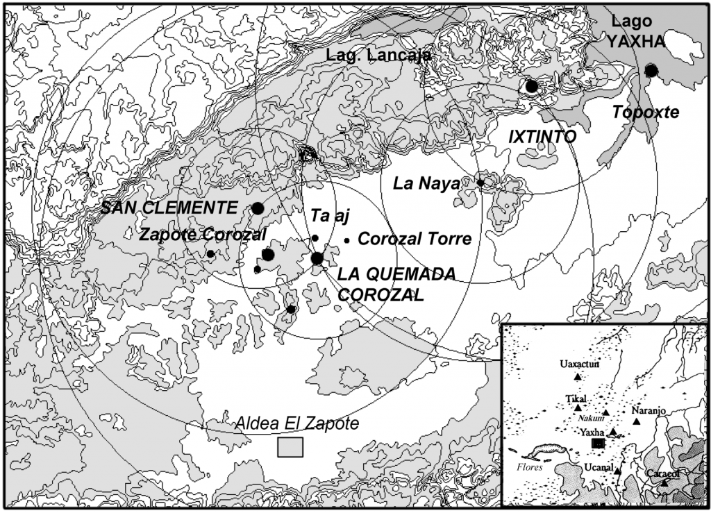 Figura 1 Localización geográfica de la sub-región central de los lagos del centro de Petén, con la ubicación de los sitios periféricos a La Quemada Corozal, y probable área de influencia